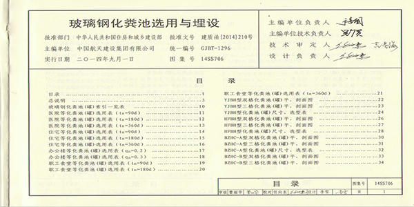 “玻璃鋼化糞池選用與埋設”國家建筑標準設計圖集14SS706,經中華人民共和國住房和城鄉建設部批準為國家建筑標準設計,自2014年9月1日起實施